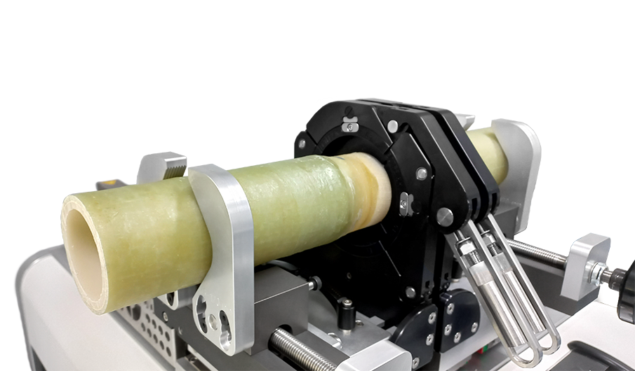 Das System umfasst ein flexibles Außenspannbackensystem, das sich auf den Außendurchmesser der GFK-Rohre anpasst, sowie innenliegende Spannbacken, die auf den Durchmesser der AGRURohre abgestimmt sind. Das gesamte Spannsystem wird in einem Koffer geliefert und kann in wenigen Handgriffen umgebaut werden.